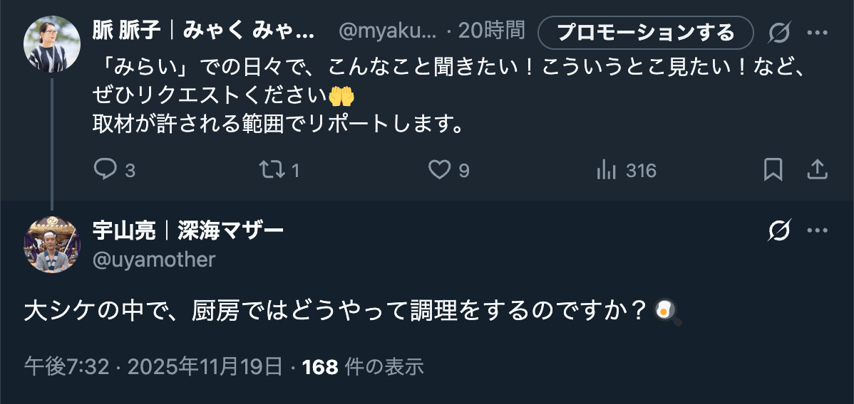 ところで、「みらい」での日々について聞きたいことがあればとTwitter(X)で募ったところ、身内からこんな質問がありました。
