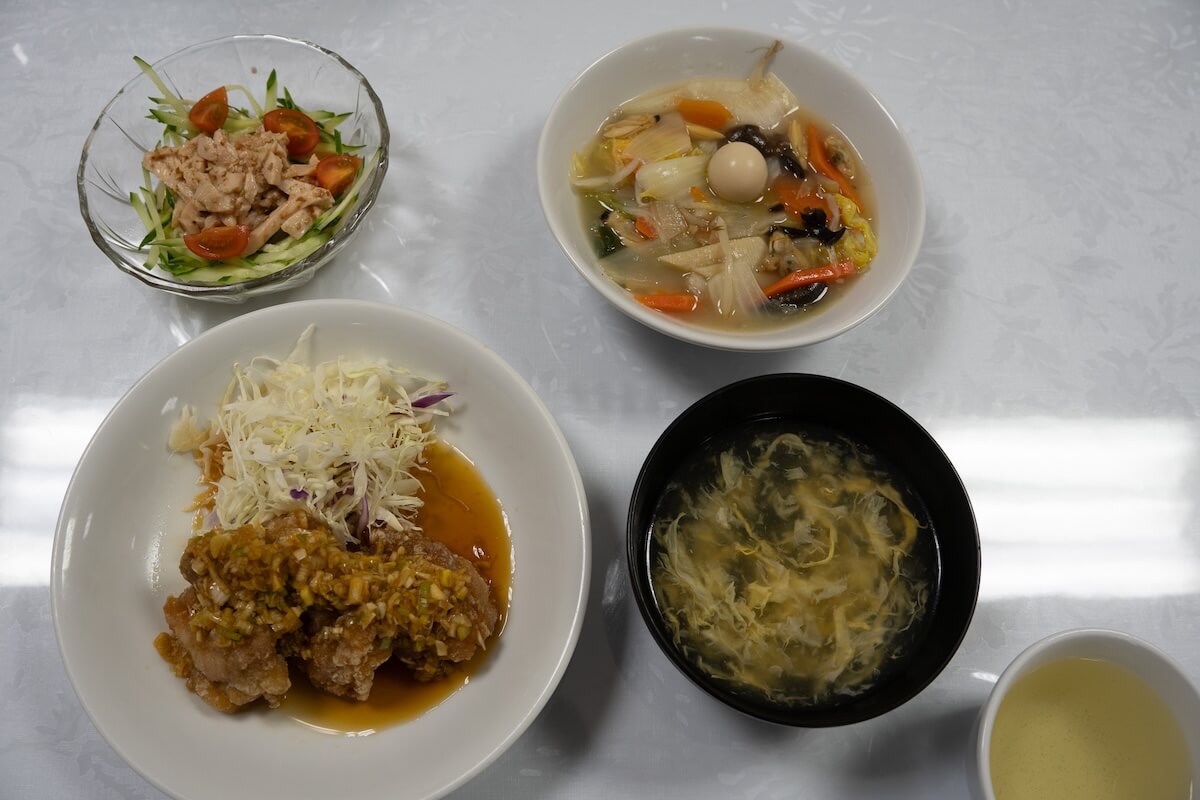 油淋鶏、八宝菜、棒棒鶏サラダ、玉子スープ