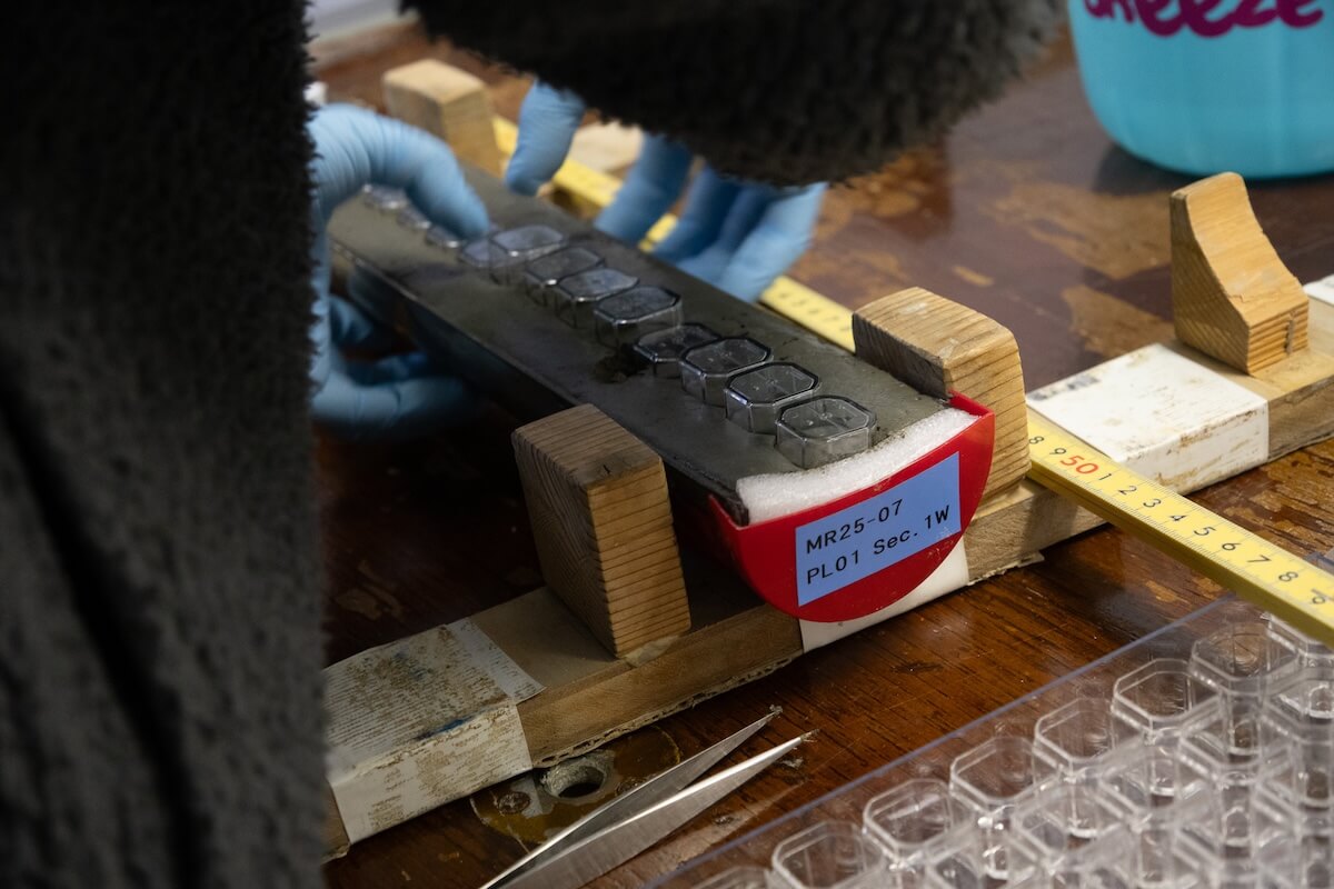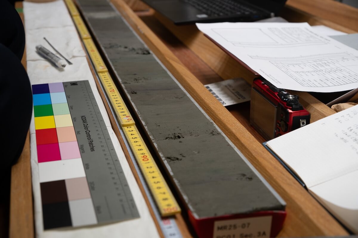 1メートルごと、ぜんぶで6つに分けられたサンプルそれぞれの見た目の特徴を記録したり、分析器に通すために小さなキューブカプセルに分けてラベリングしたり。午後から始まった地道な作業は夕方遅くまで続きました。