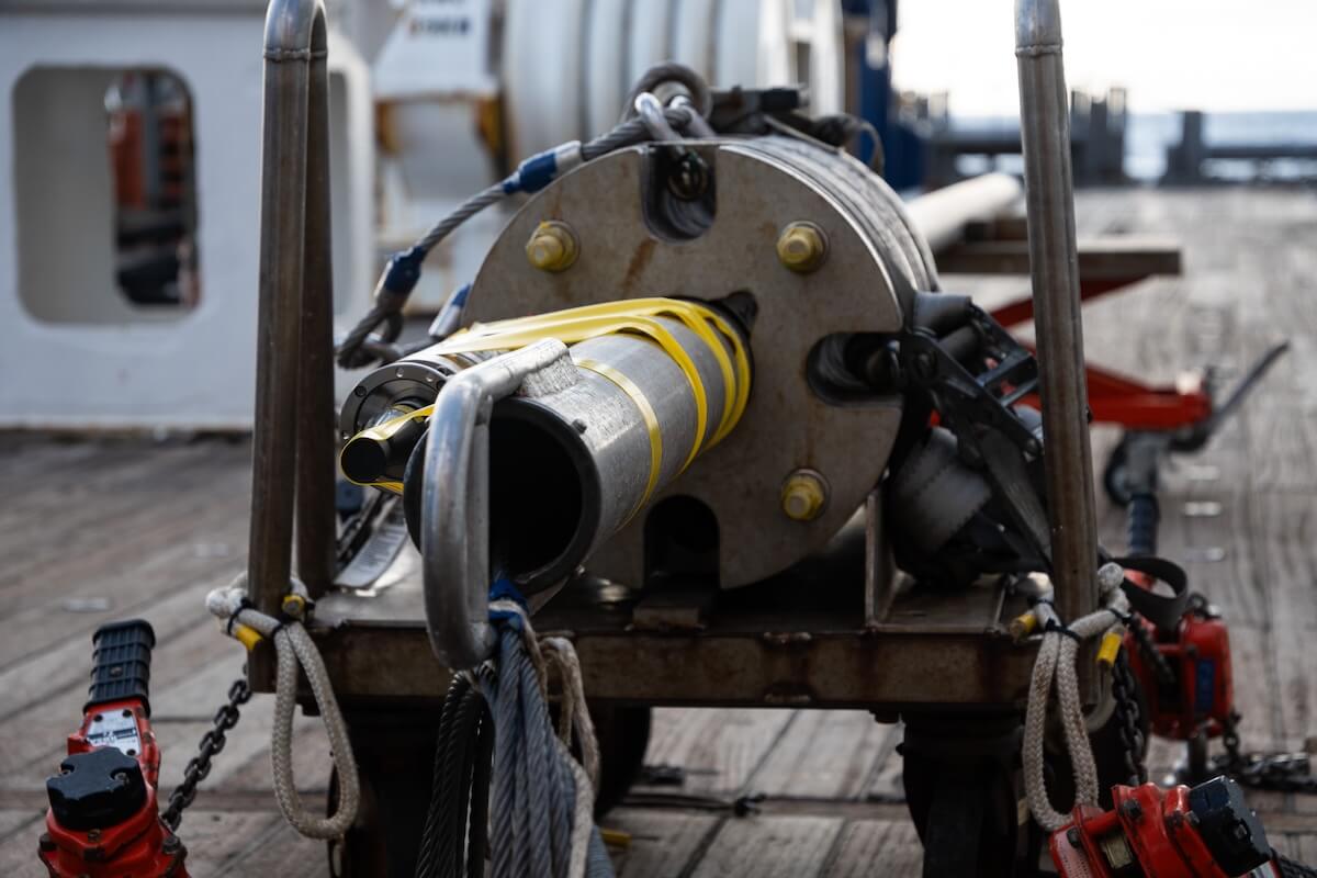 ピストンコアラーの装置。奥側に6メートルのパイプが付いてる。