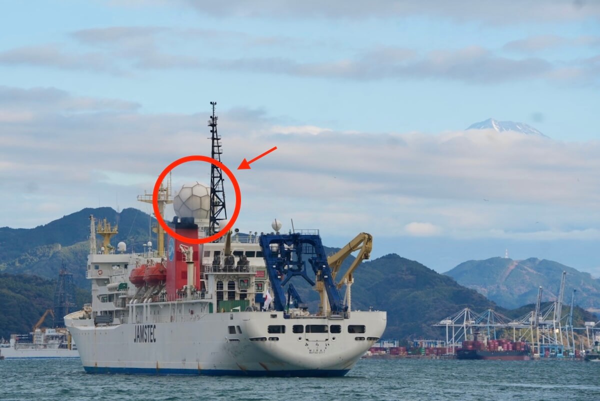 最後の航海を終えた11月29日以来、清水港にとどまっていた「みらい」が横浜に向けて出発するのを見送ってきました。横浜へ行くのは、ドップラーレーダーという気象観測装置を納めたドームのカバーを取り外す工事のため。このカバー、名前をレドームと言いますが、見た目があまりにサッカーボール。愛称として定着していて、わたしも親しみを込めてそう呼んでいます。