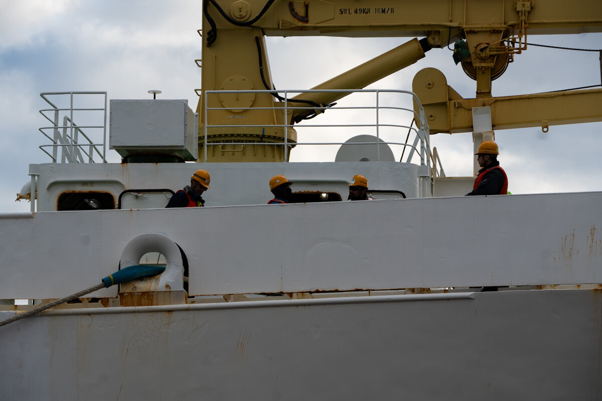 ドローン撮影があることは、JAMSTECから船側にも事前に通達されている。目の前を飛ぶドローンに気づいた船員さんたち、「あっ!ほんとに撮ってる」と思ったかどうかは分からないが、ほんのりと背筋が伸び、少しはにかんだように見えた。
